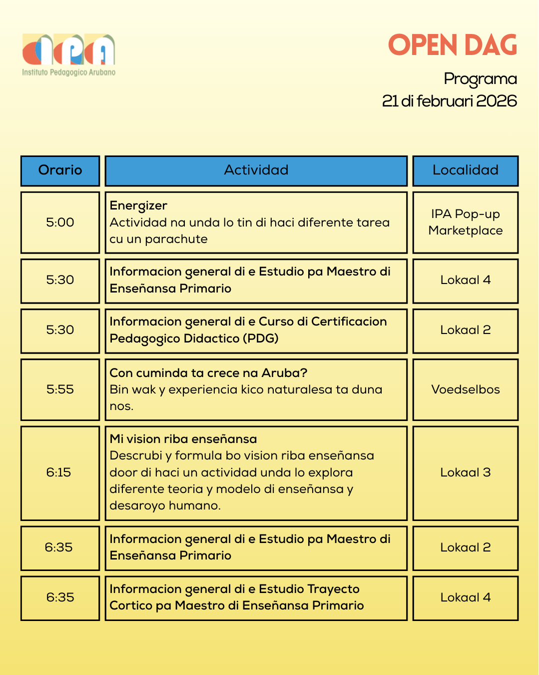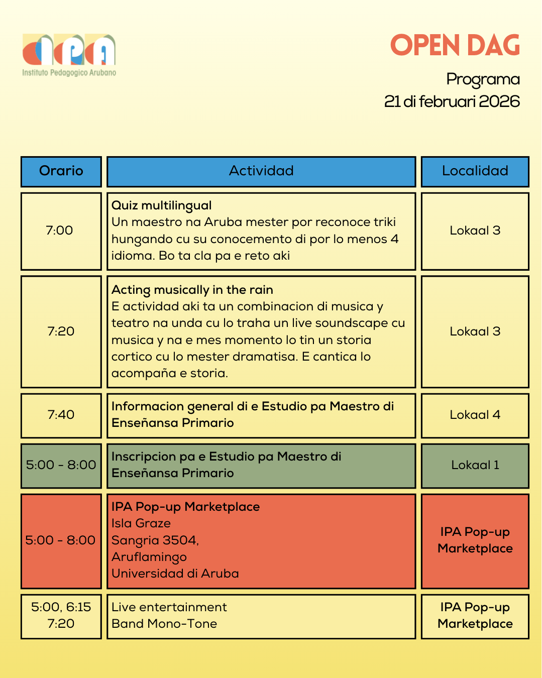 Diasabra dia 21 di februari, Instituto Pedagogico Arubano (IPA) ta tene su open dag 2026. Esaki ta di 5:00 pm – 8:00 pm y ta tuma luga na IPA (Isaac Wagemakerstraat 11, San Nicolas).
